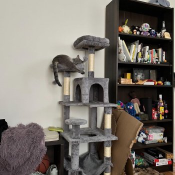 My cat loves this cat tower! It was super easy to assemble (about 15 minutes), and for the price it is pretty nice and big. Obviously not the highest quality material, but sturdy enough to hold up to my cat's frenzied climbing and jumping. My cat is on the smaller side, so it is perfect for her (around 8-9 lbs), but I do think bigger cats might have trouble sleeping in the cubby since she fills it almost completely up when she is curled up in there, so keep that in mind if you have a chonker. Also I had to wedge a piece of cardboard under one of the sides because it wobbled a bit. I've only had it a few days, but it has already become my cat's favorite hangout spot!